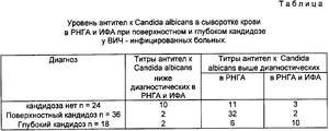 Metoda diagnostiky kandidózy u HIV infekce je založena na zohlednění výsledků dvou sérologických testů – RNGA a ELISA – současně. Pokud jsou titry protilátek proti Candida albicans v krevním séru detekovány nad diagnostické hodnoty pouze u RNGA, je diagnostikována povrchová kandidóza, a pokud jsou titry protilátek proti Candida albicans v krevním séru detekovány nad diagnostické hodnoty současně ve dvou reakcích – u RNGA a ELISA (> 1:400), je diagnostikována hluboká kandidóza. Účinnost navržené diagnostické metody je 76,36 a 80 % pro každou klinickou formu. 1 stůl.